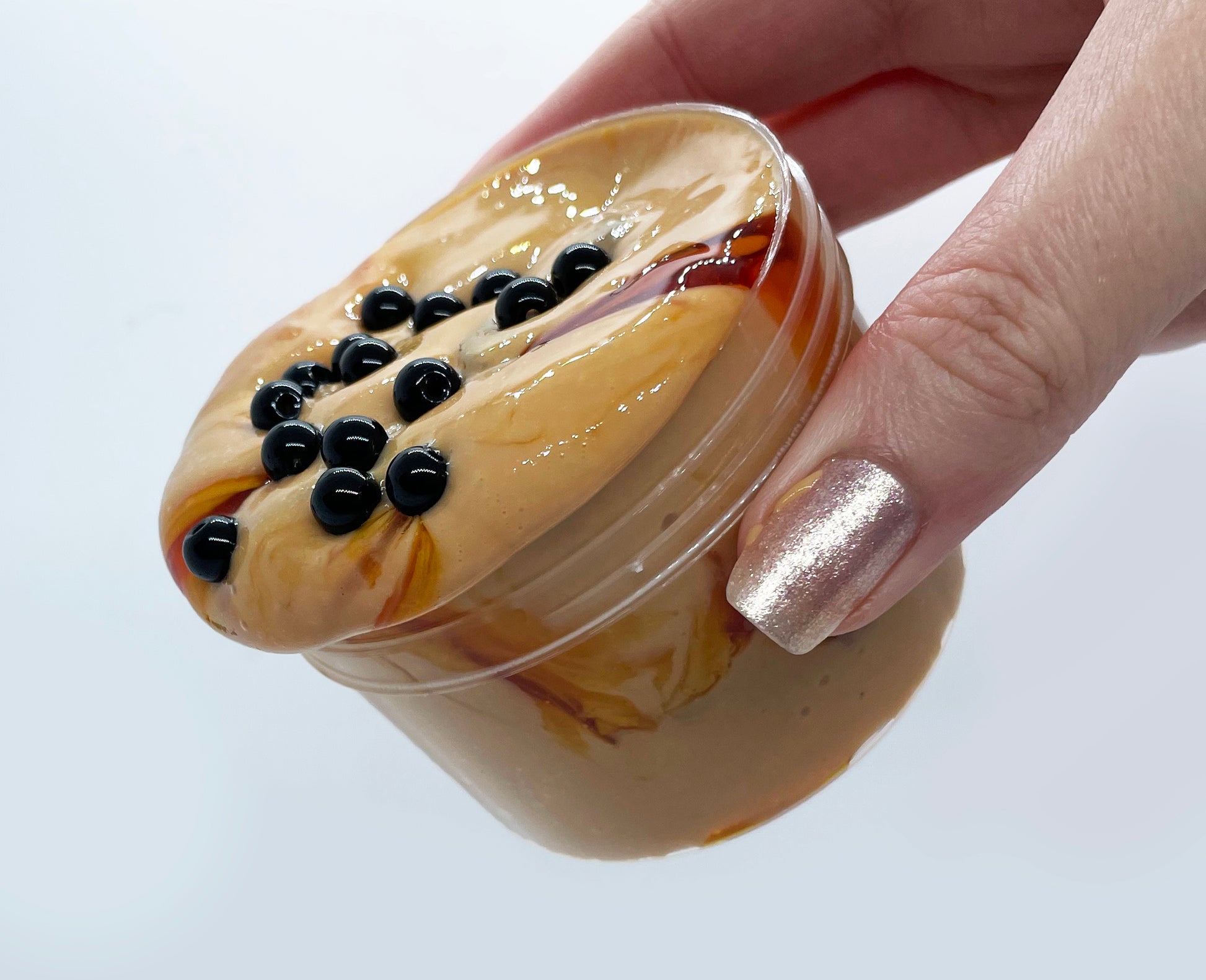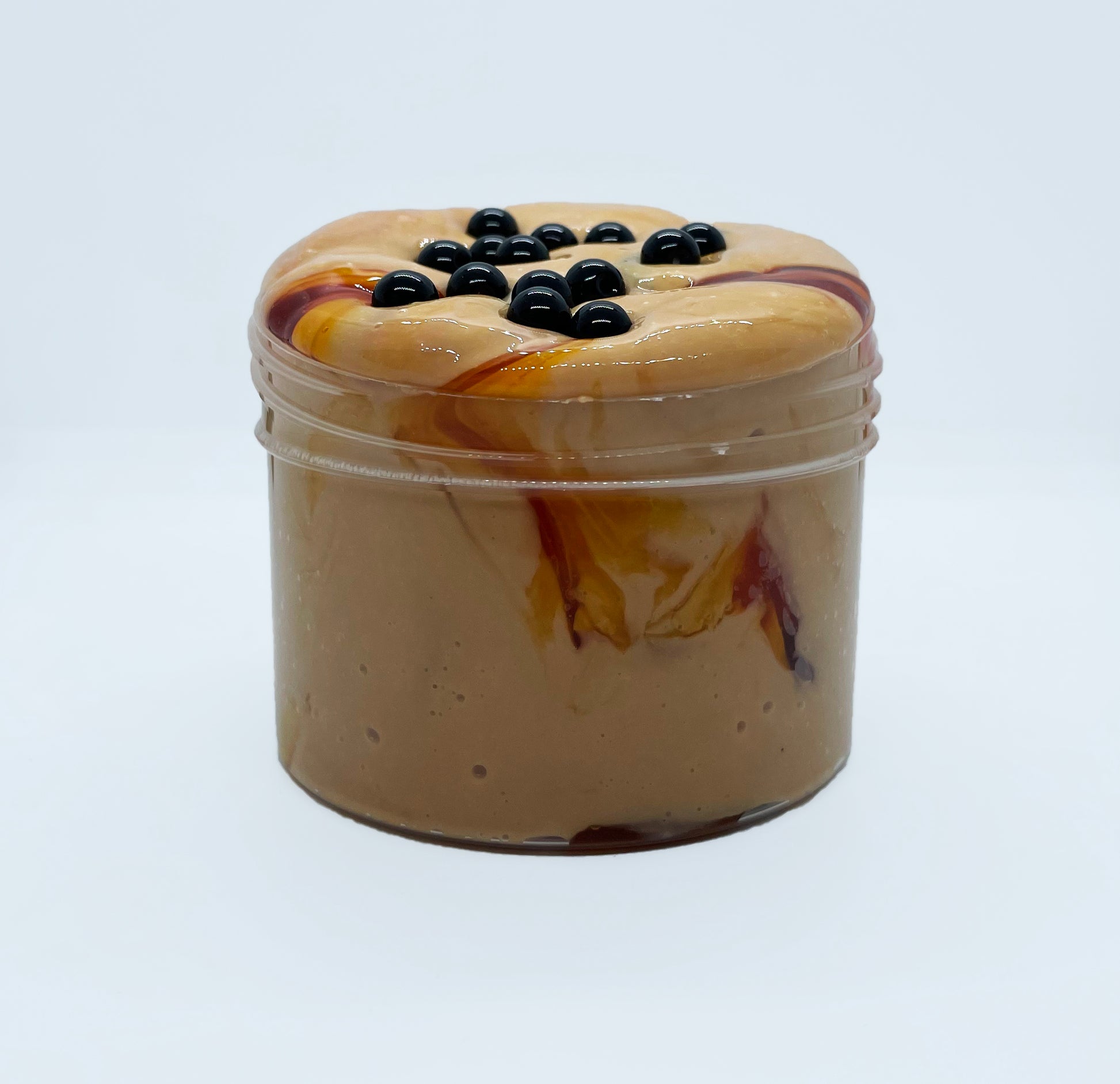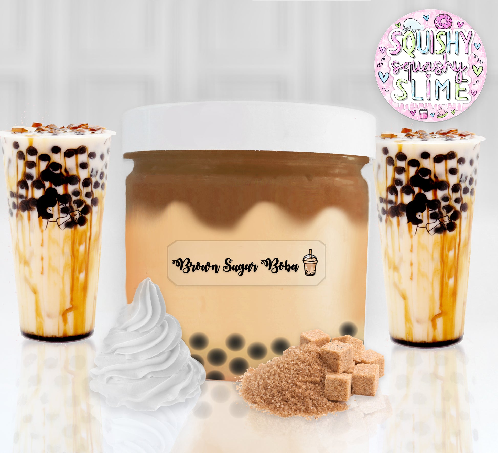Another spin to our best-selling taro milk slime. A thick, glossy slime that topped with "brown sugar" sauce and boba beads.
