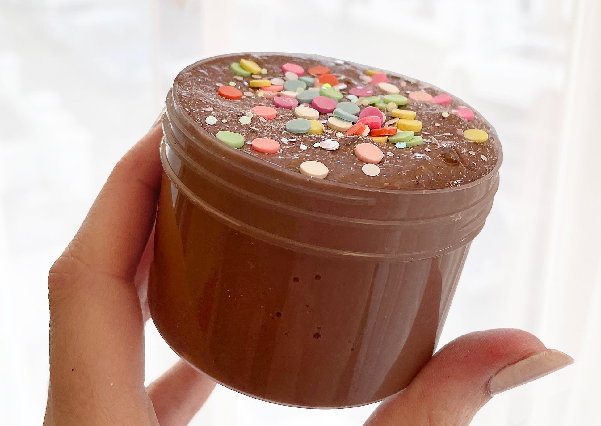 A thick glossy slime that comes with clay sprinkles and crunchy "chocolate" beads. Scented with a delicious chocolate brownie scent.