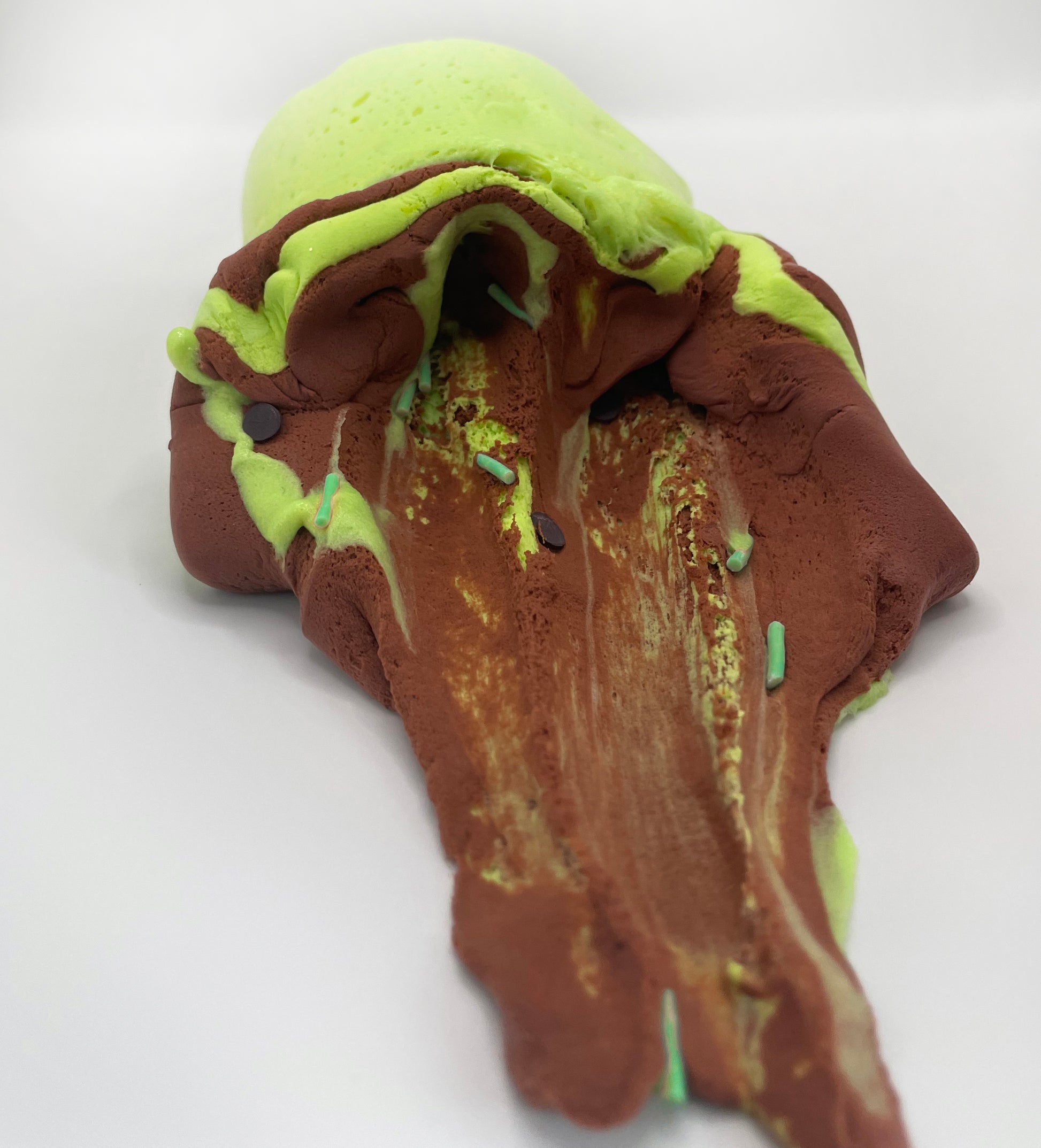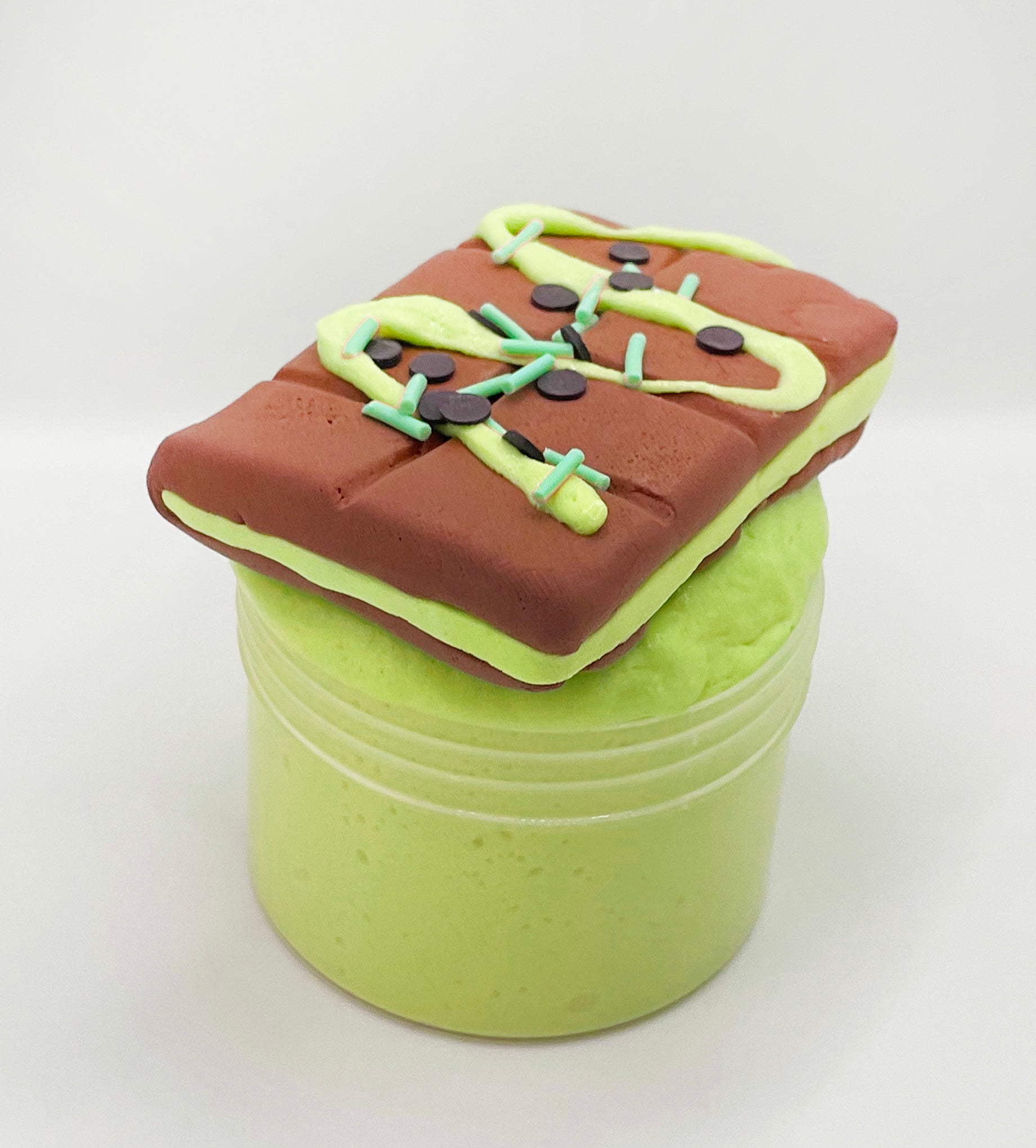 A thick cloud slime that comes with sprinkles and a DIY clay pistachio chocolate bar to mix in. A DIY clay slime that comes topped with various sprinkles. Once mixed together, it combines to a thick cloud creme slime that smells lovely. Scented like pistachio chocolate.