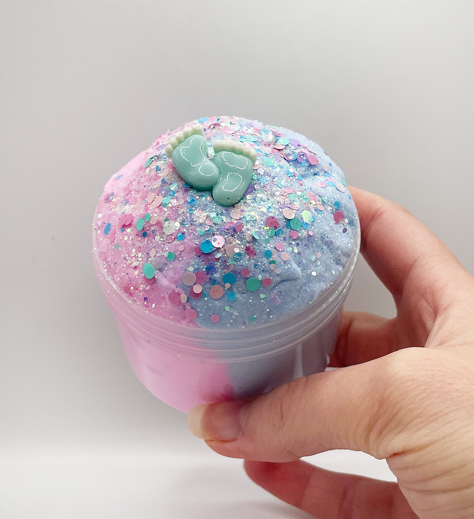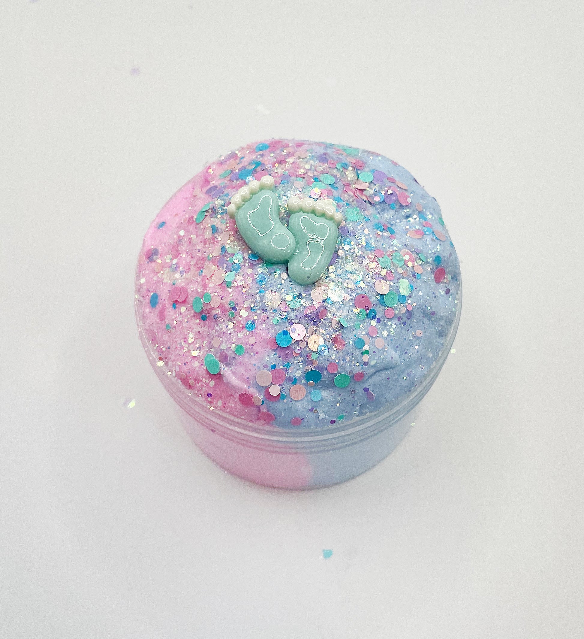 A duo-toned thick, spreadable cloud creme that is perfect for beginners due to its holdability. It inflates a lot when played with and mixes to a pastel purple when combined. Comes topped with various glitters and a baby feet charm. Perfect for anyone to celebrate a new addition in the family or as a gift for yourself.