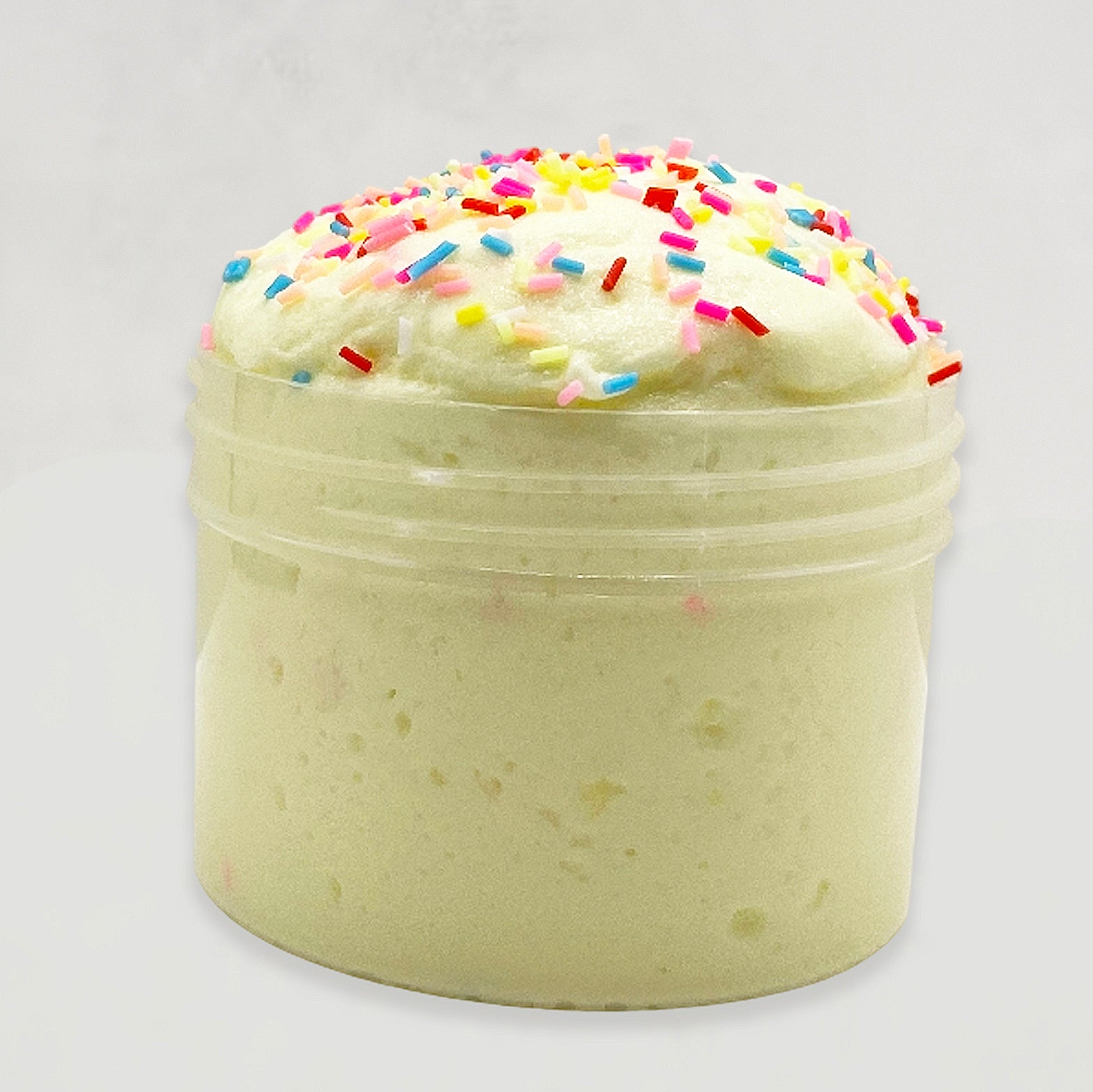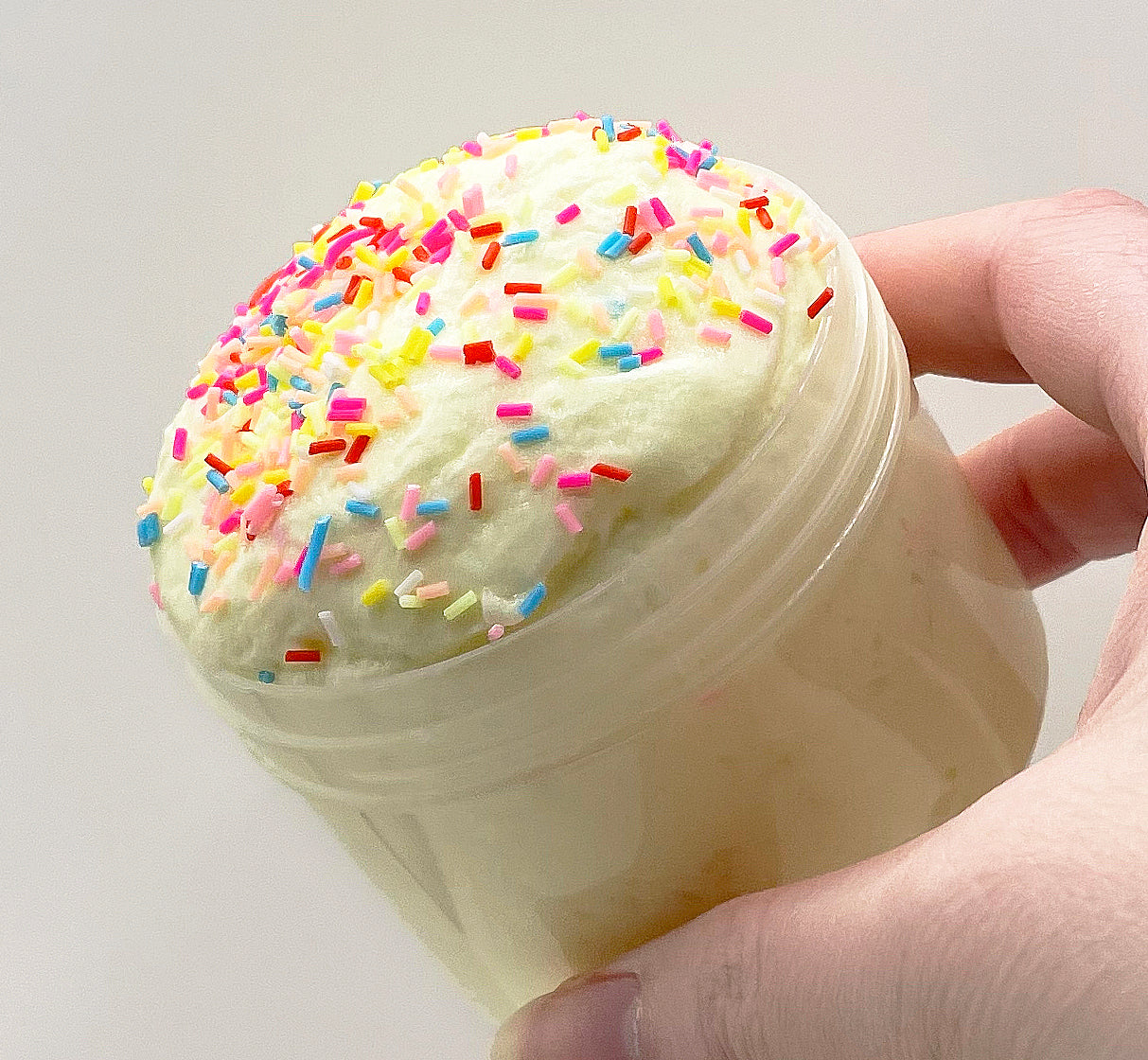 A thick cloud creme slime is perfect for beginners due to its holdability. It inflates a lot when played with. Comes topped with sprinkles. Scented like vanilla buttercream.