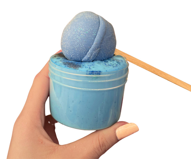 A blue thick glossy base that comes with a DIY clay lollypop to mix in. Once combined mixes into a mid-blue butter slime. Scented with a tangy and sweet blue raspberry scent.