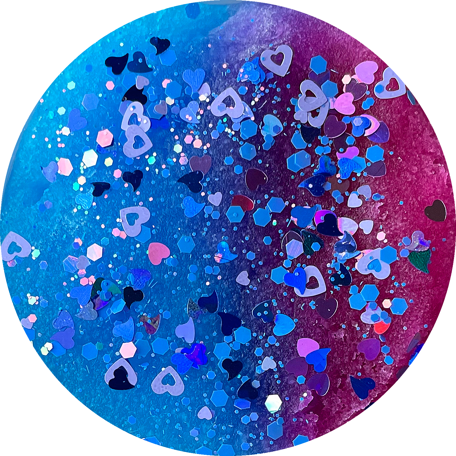 A sizzly, soft icee slime that comes topped with heart glitters. Half pink and half blue, the colors will not combine in shipping due to the thick nature of the slime. Scented like a blue raspberry and cherry slushee. Once mixed, combines to a thick, purple icee slime.