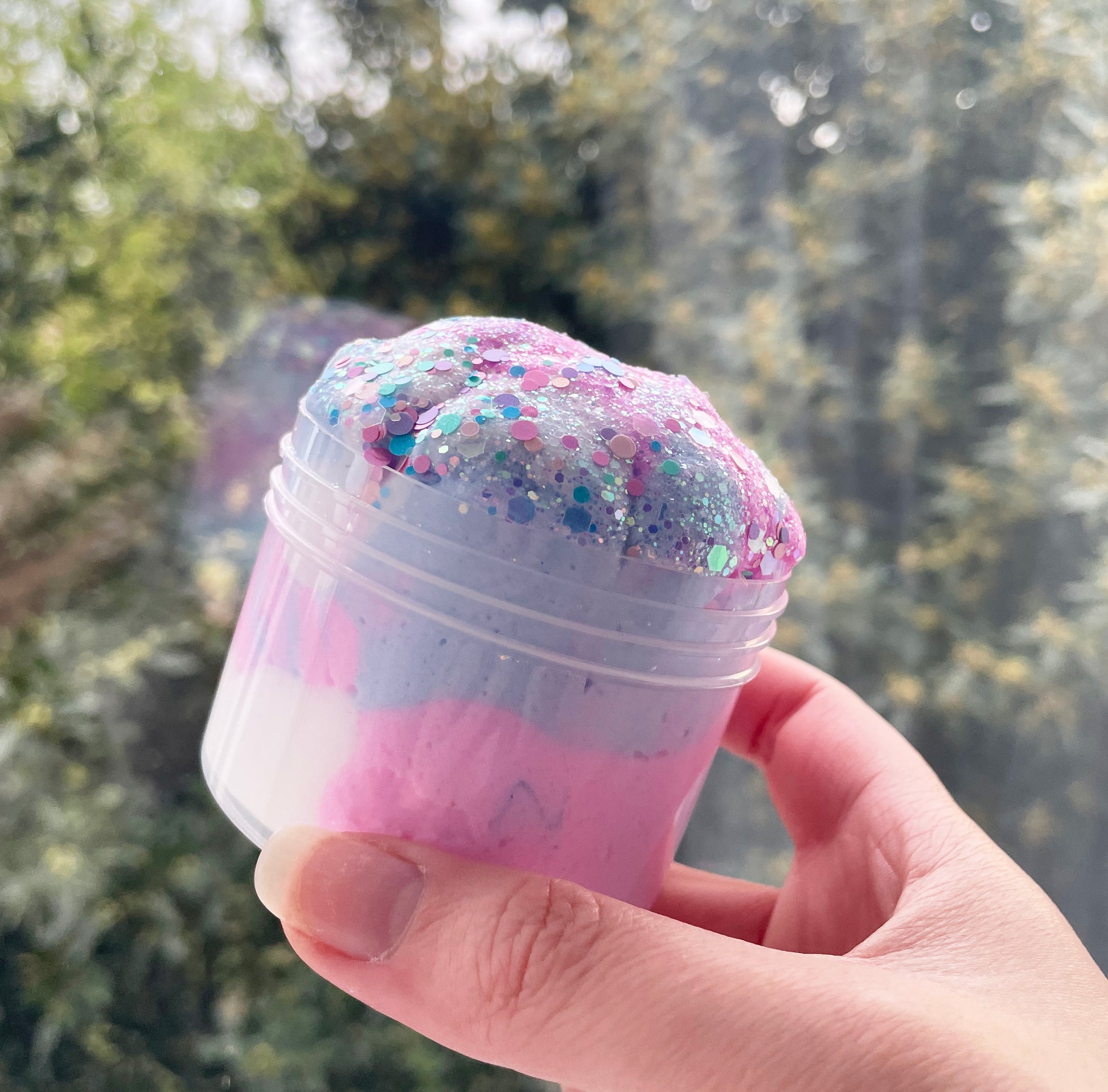NEW in the store. A thick, spreadable cloud creme that is perfect for beginners due to its holdability. It inflates a lot when played with. A trio-toned pastel slime that comes topped with various glitters. Once mixed together, it combines to a pretty purple cloud creme slime that smells lovely. Scented like candy floss.