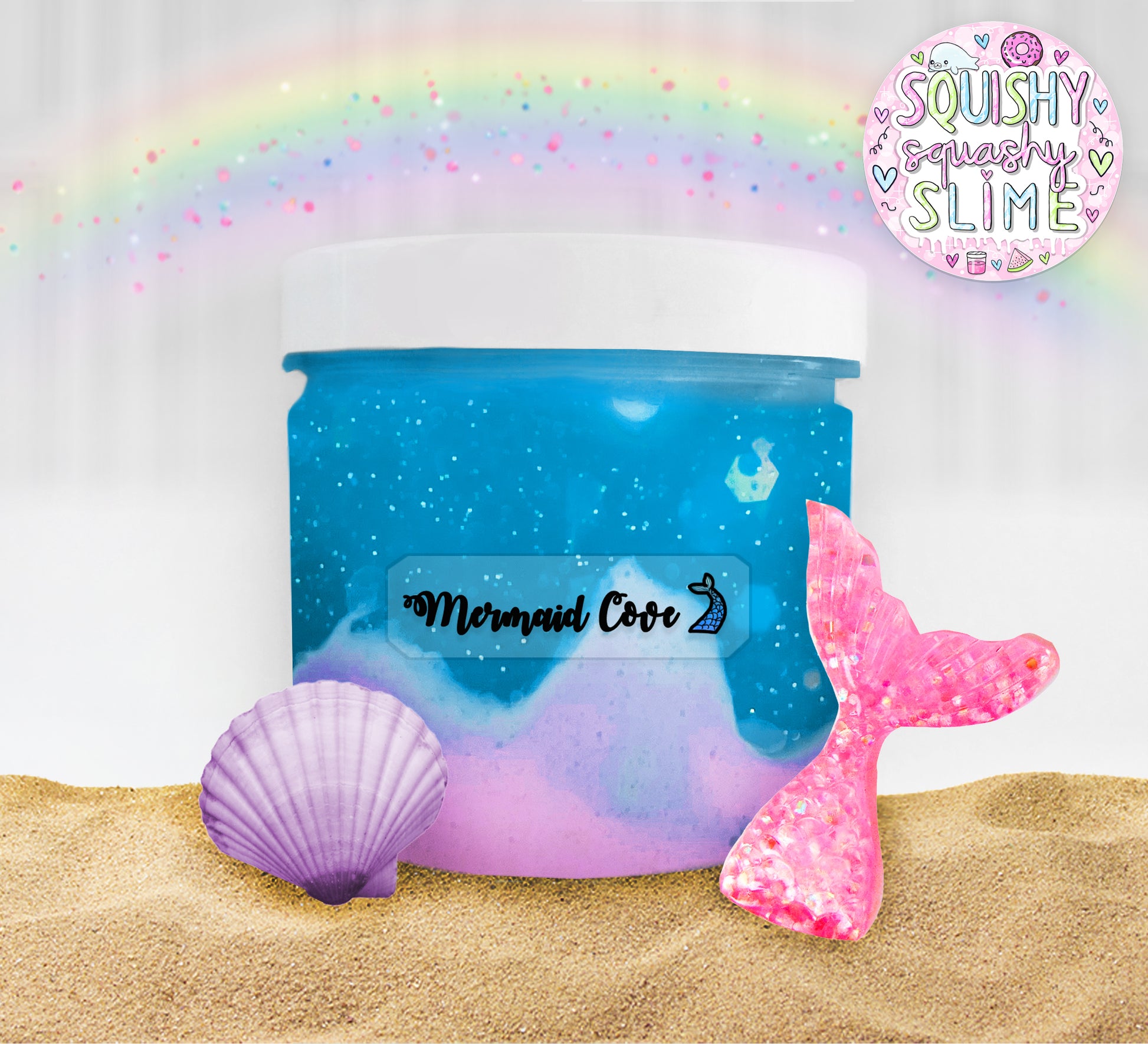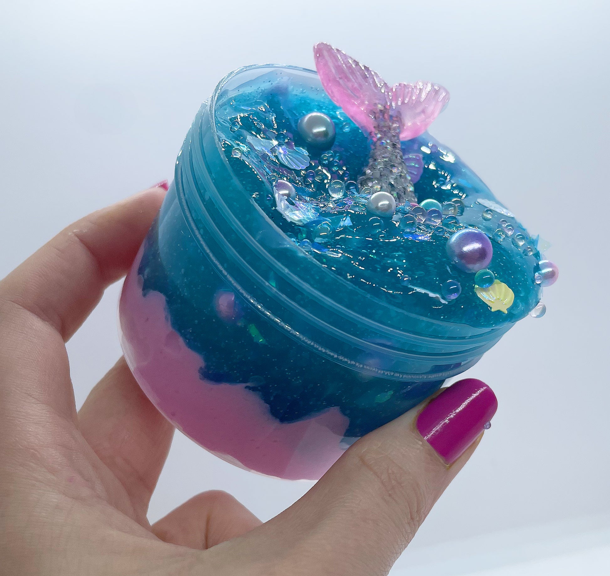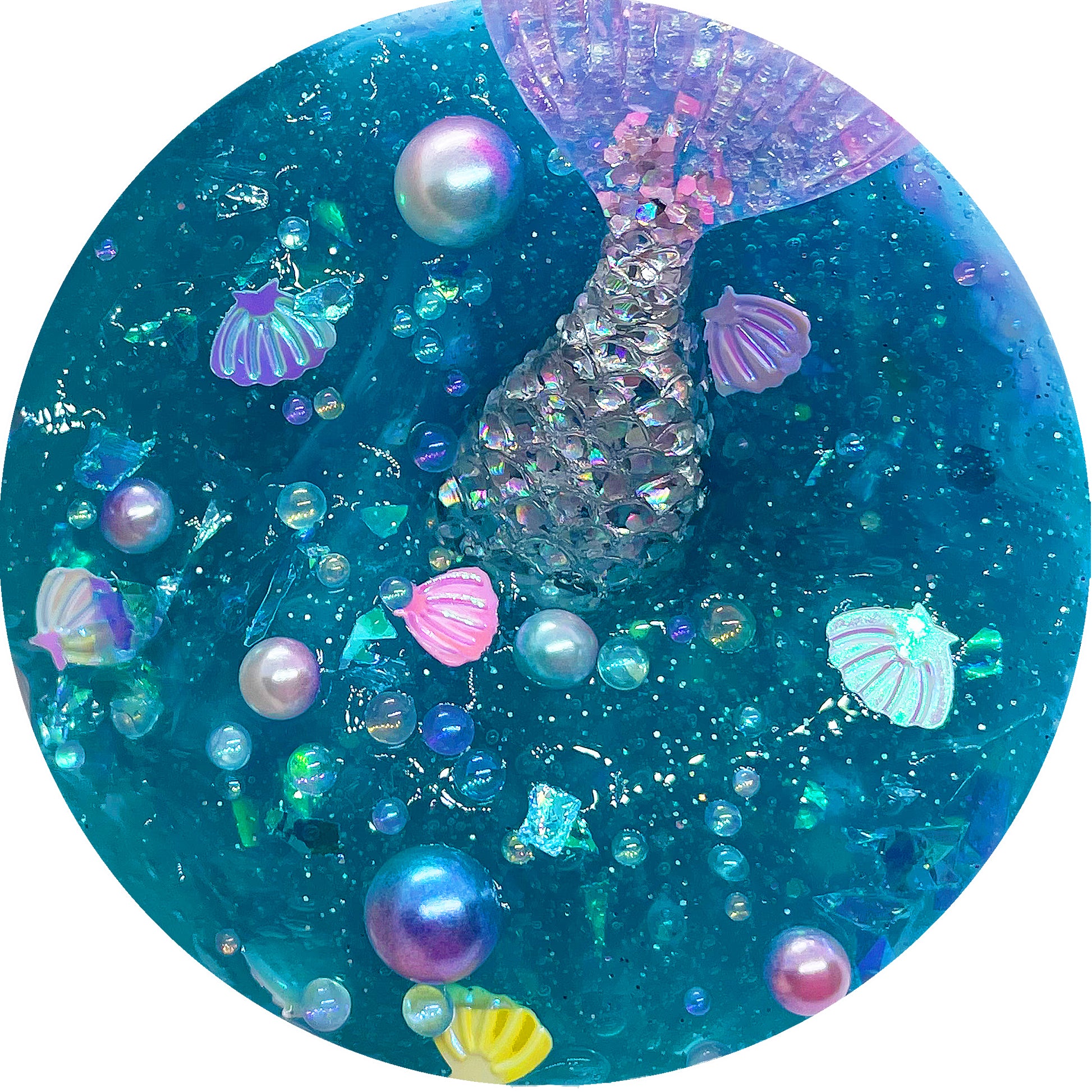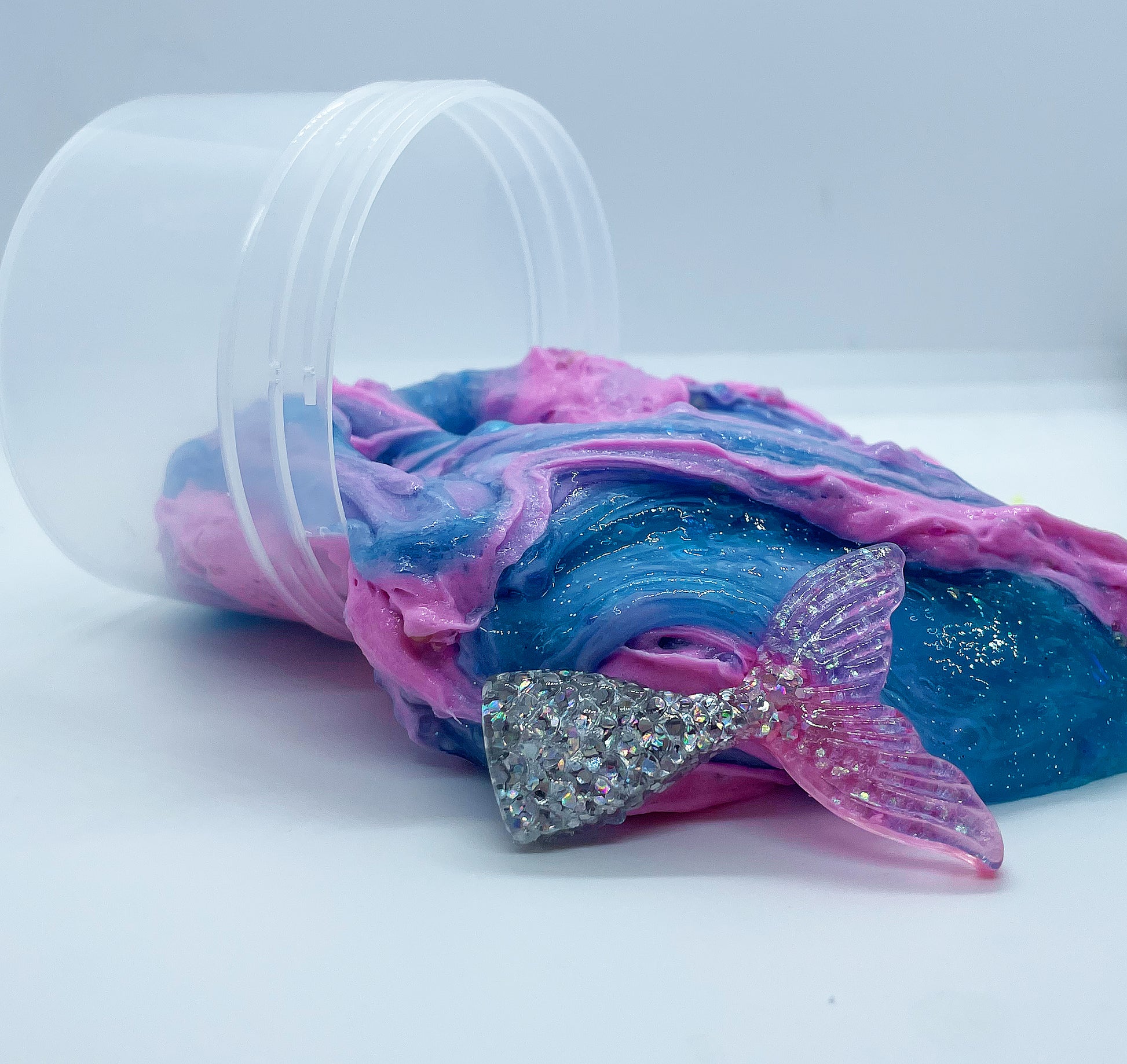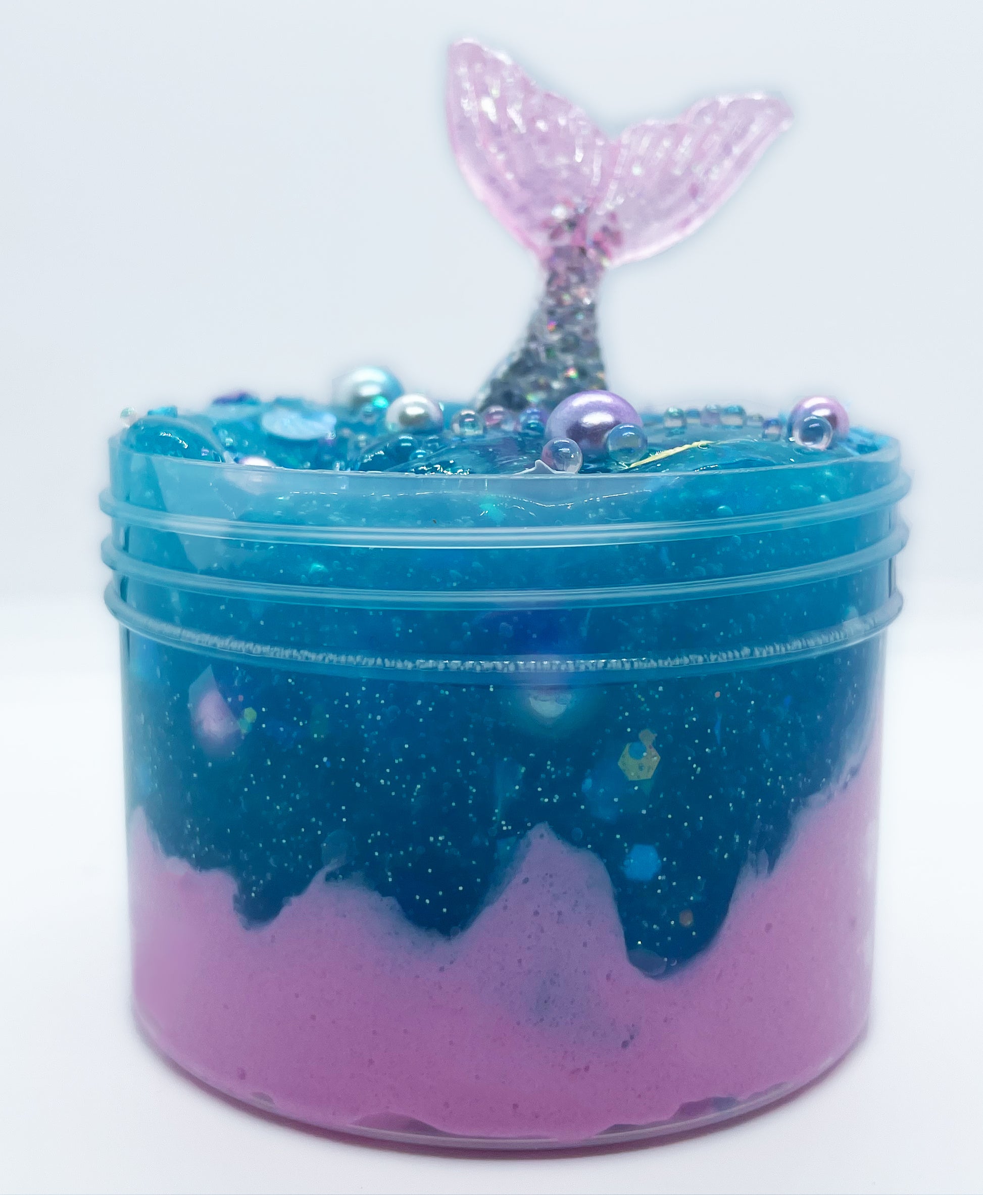 A sparkly clear slime that comes combined on a thick pink cloud creme base. Comes topped with pearls, mini pearl stones and shimmery glitter flakes. Combines to a thick, buttery purple slime. Comes with a mermaid tail charm. Scented with our Mermaid Dreams blend.