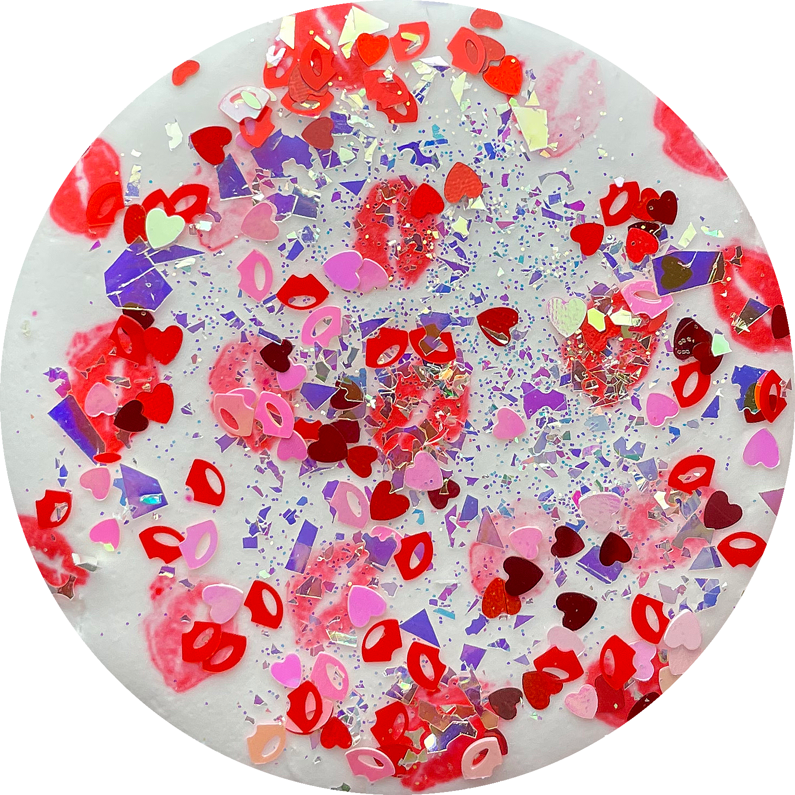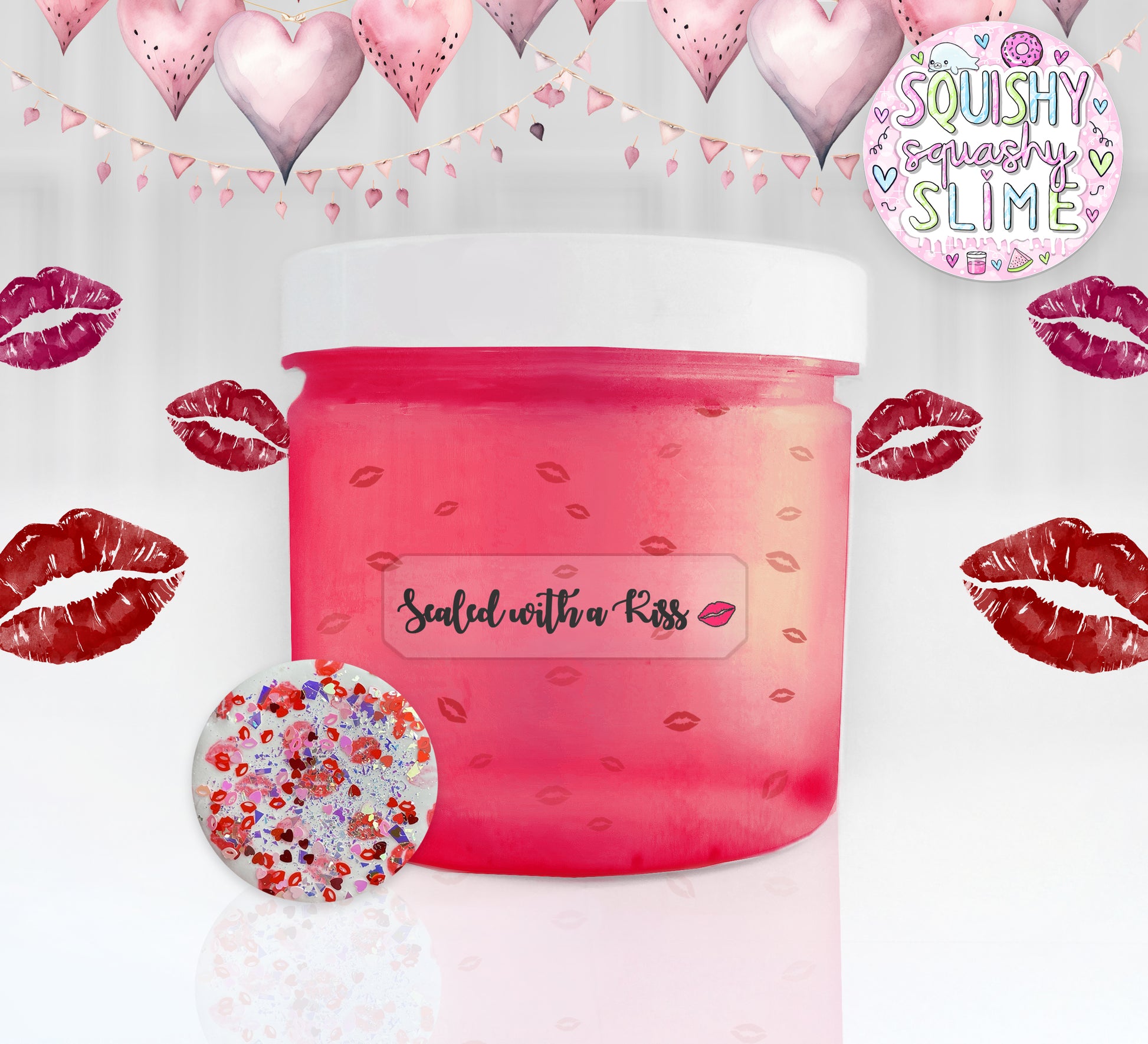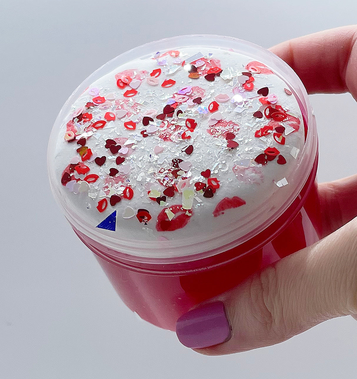 A thick and glossy slime base that comes with a DIY clay circle with kiss marks and topped with kiss glitters. Scented like roses.