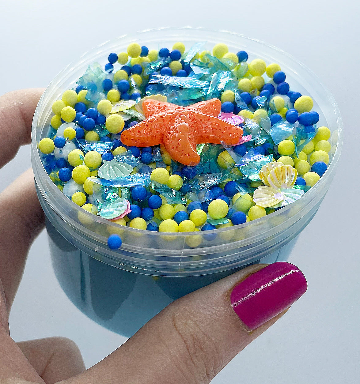 A thick and mixed floam that comes with various foam balls. Comes with a sea-themed charm. Scented like seaside breeze.