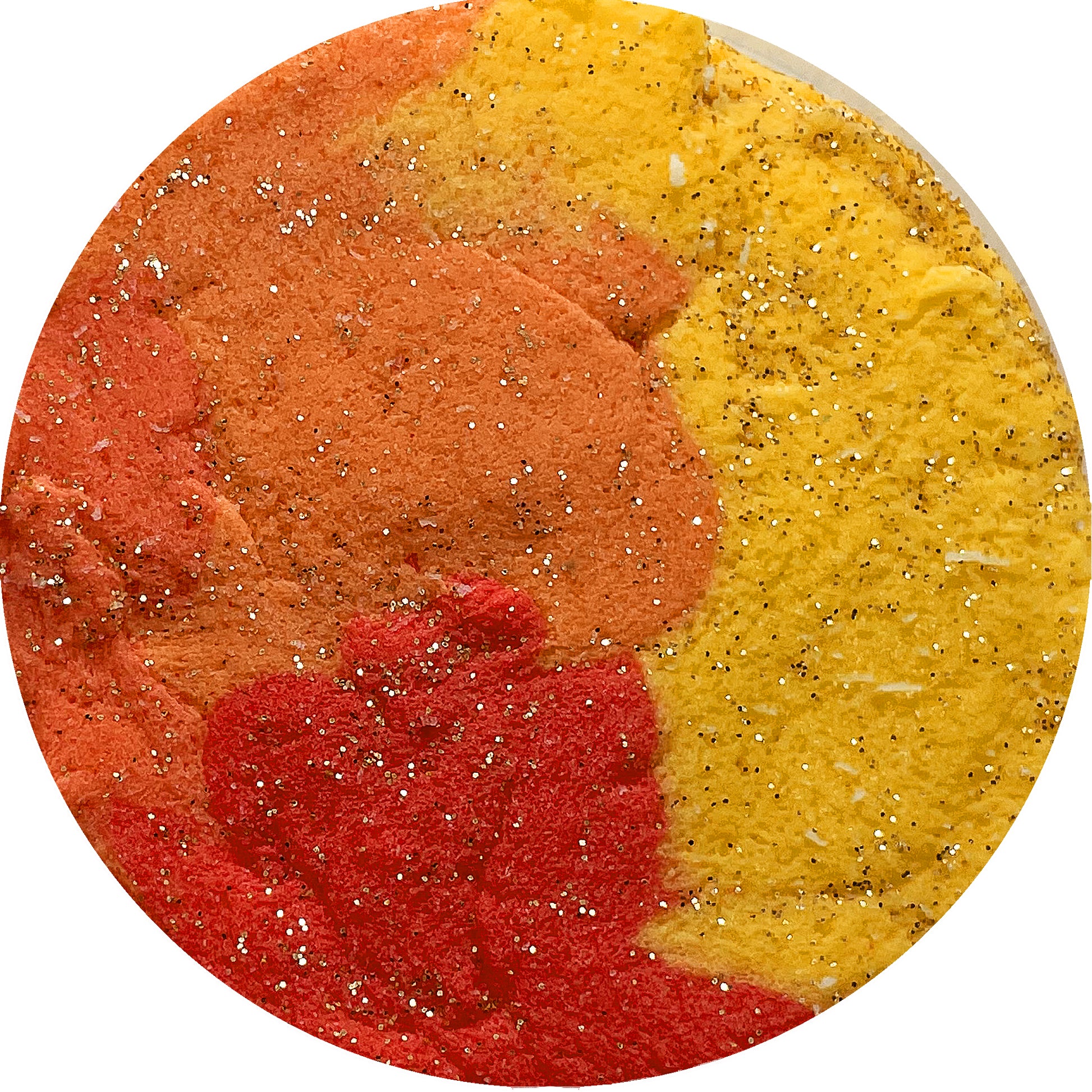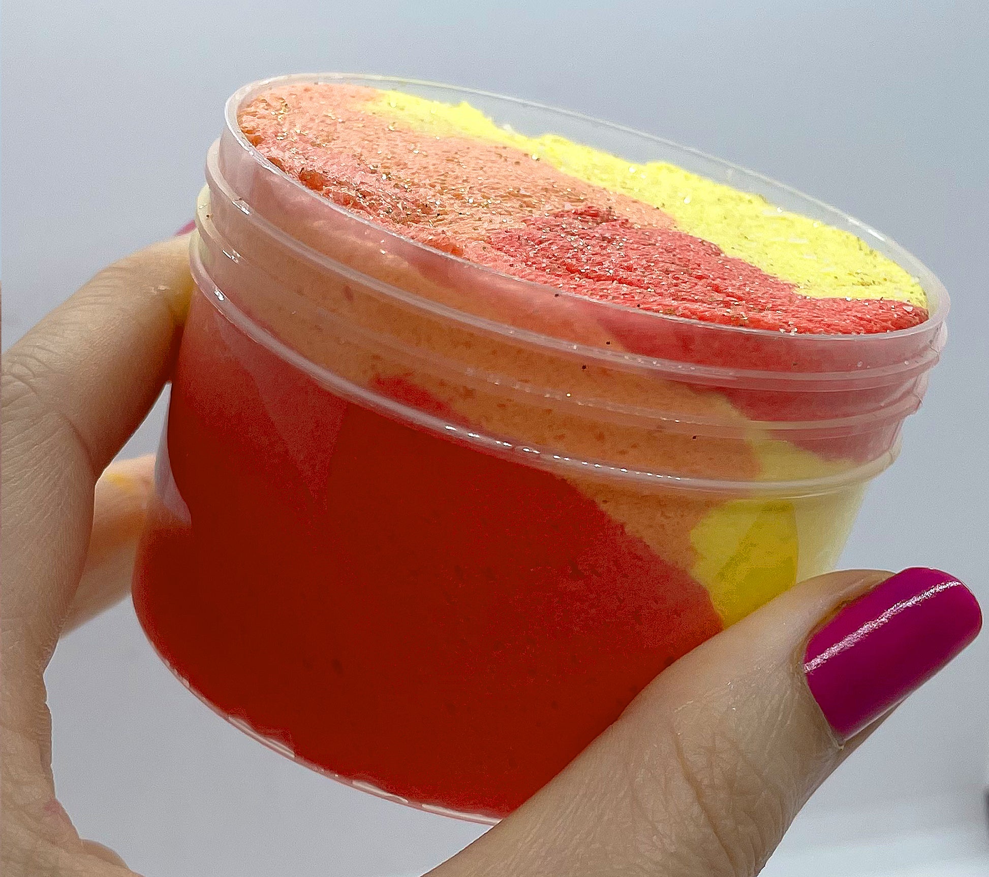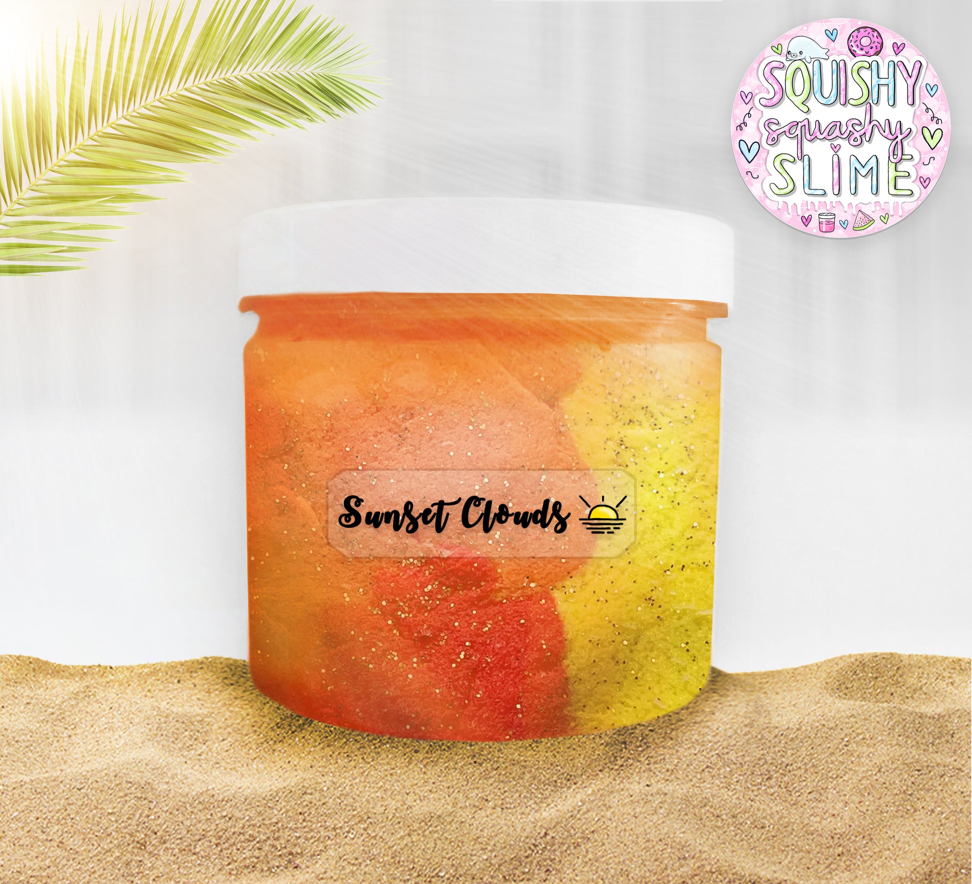 A thick, cloud creme slime in three different shades that comes topped with glitter. Mixes to to a thick and holdable reddish-orange cloud creme. Scented with our Sunset Aromatic scent blend.